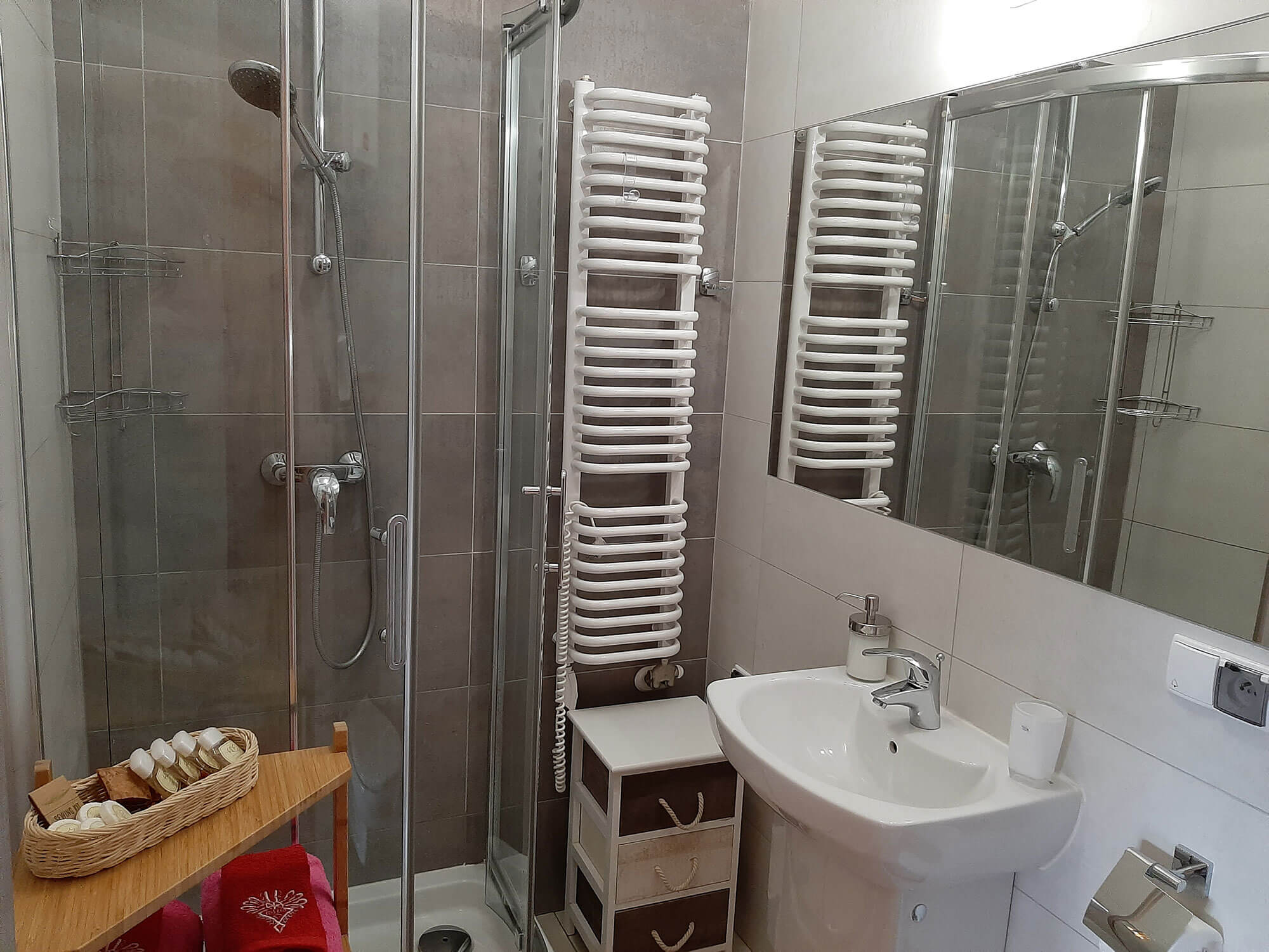 з душавой кабінай, сушылка-абагравальнік на сцяне, набор ручнікоў, касметыка: гіпоаллергеннае вадкае мыла, гель + шампунь + мыла, цёплая падлога,